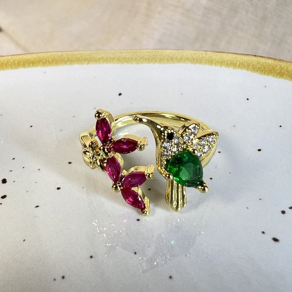 Anillo Baño oro Flor y Colibri Colores (250626-261)