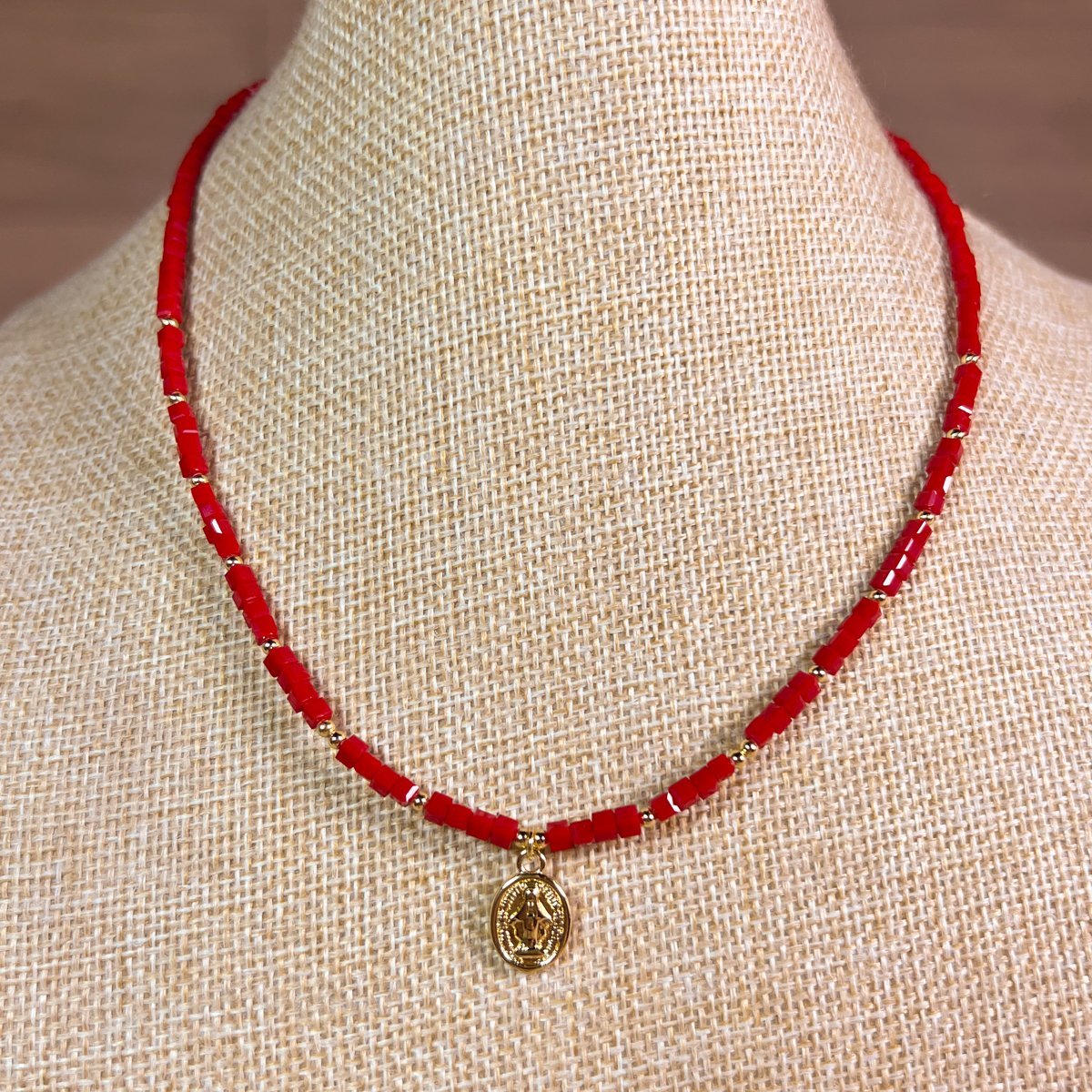 Collar baño oro 42cm + 6cm Alargue Cristal Cuadrado Rojo Virgen de los Rayos