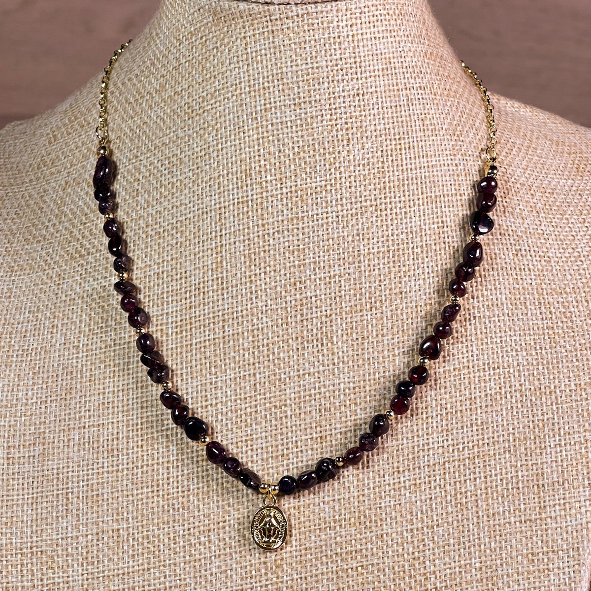 Collar baño oro 43cm + 6cm Alargue Piedra Granate Natural Virgen de los Rayos