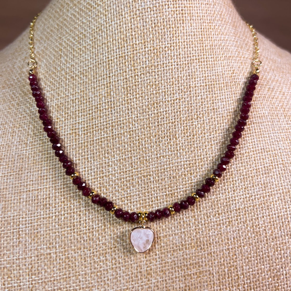 Collar baño oro 45cm + 5cm Alargue Cristal rojo oscuro Corazón Cuarzo