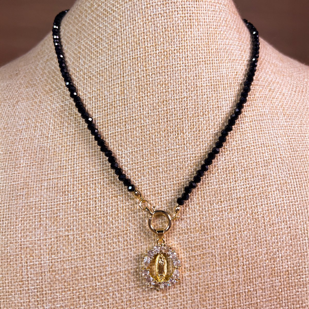 Collar baño oro 45cm + cm Alargue Cristales Negros Virgen de Guadalupe Circones