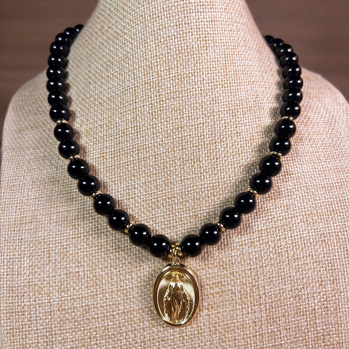 Collar baño oro 47cm + 5cm Alargue Agatas Negras Virgen de los Rayos
