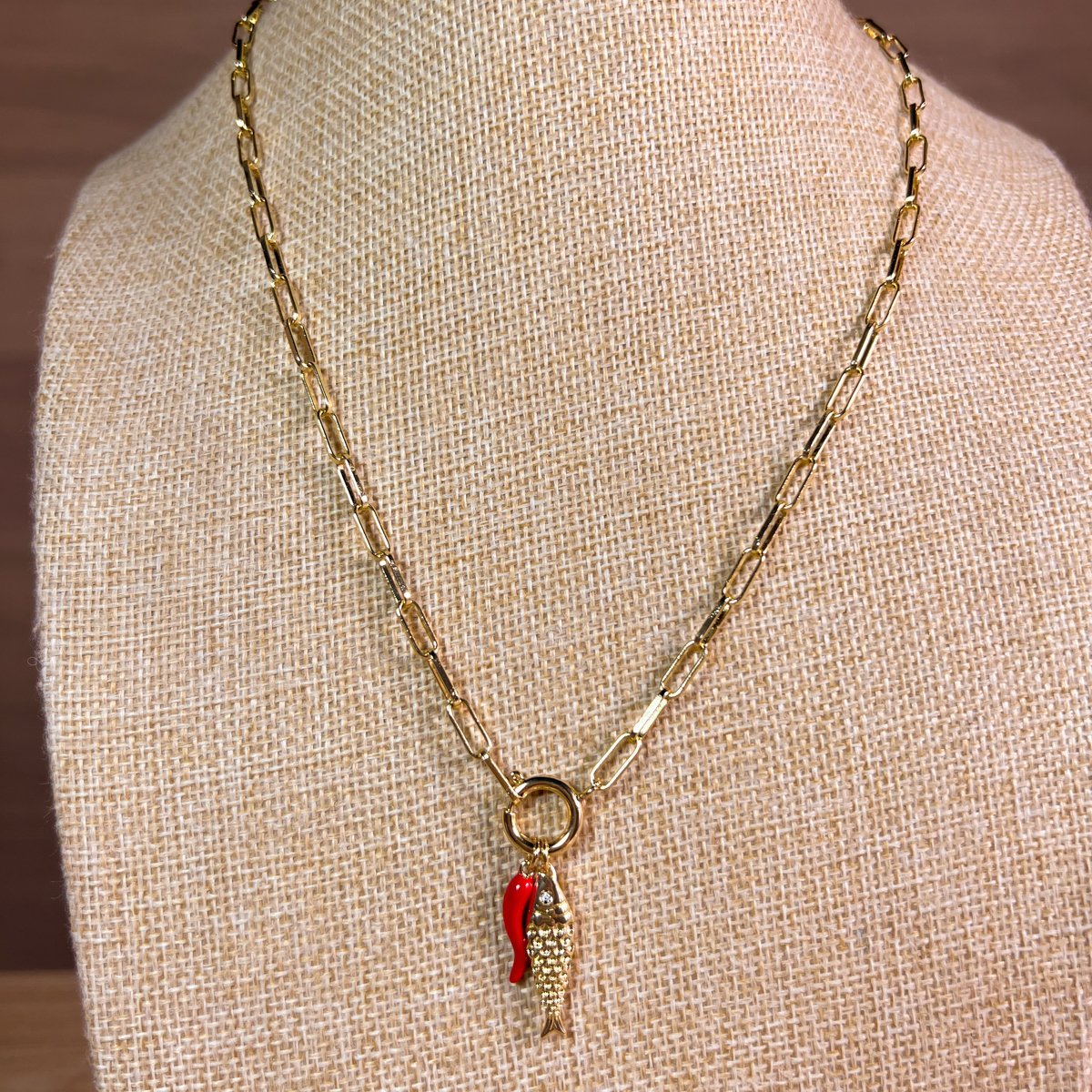 Collar baño oro 50cm + cm Alargue Cadena Clip Pez y Aji (Cornicello)