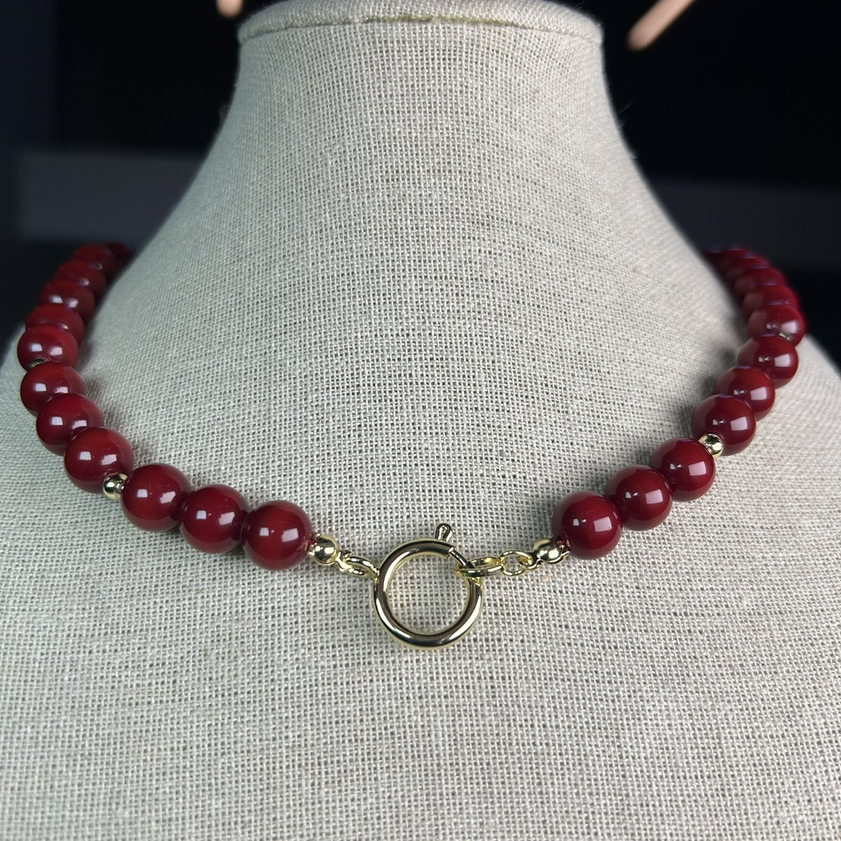 Sé el primero en valorar “Collar baño oro Agatas rojo oscuro con broche timón en la parte de adelante y balines (251125-360)”