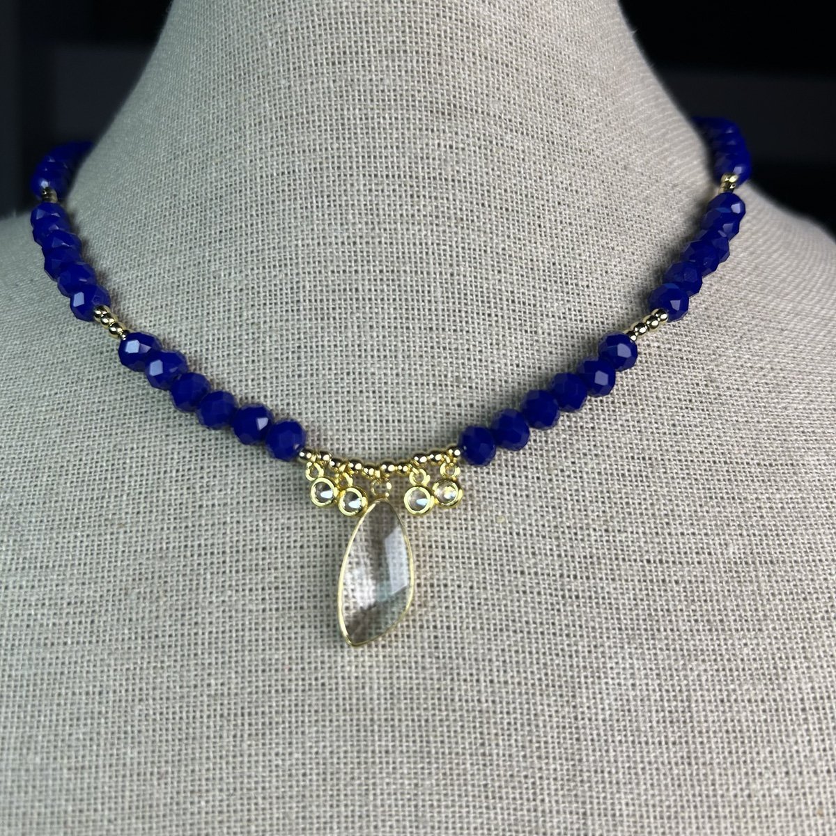 Cristales azul oscuro con punto de luz y dije de cristal transparente