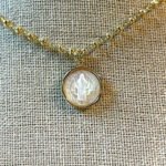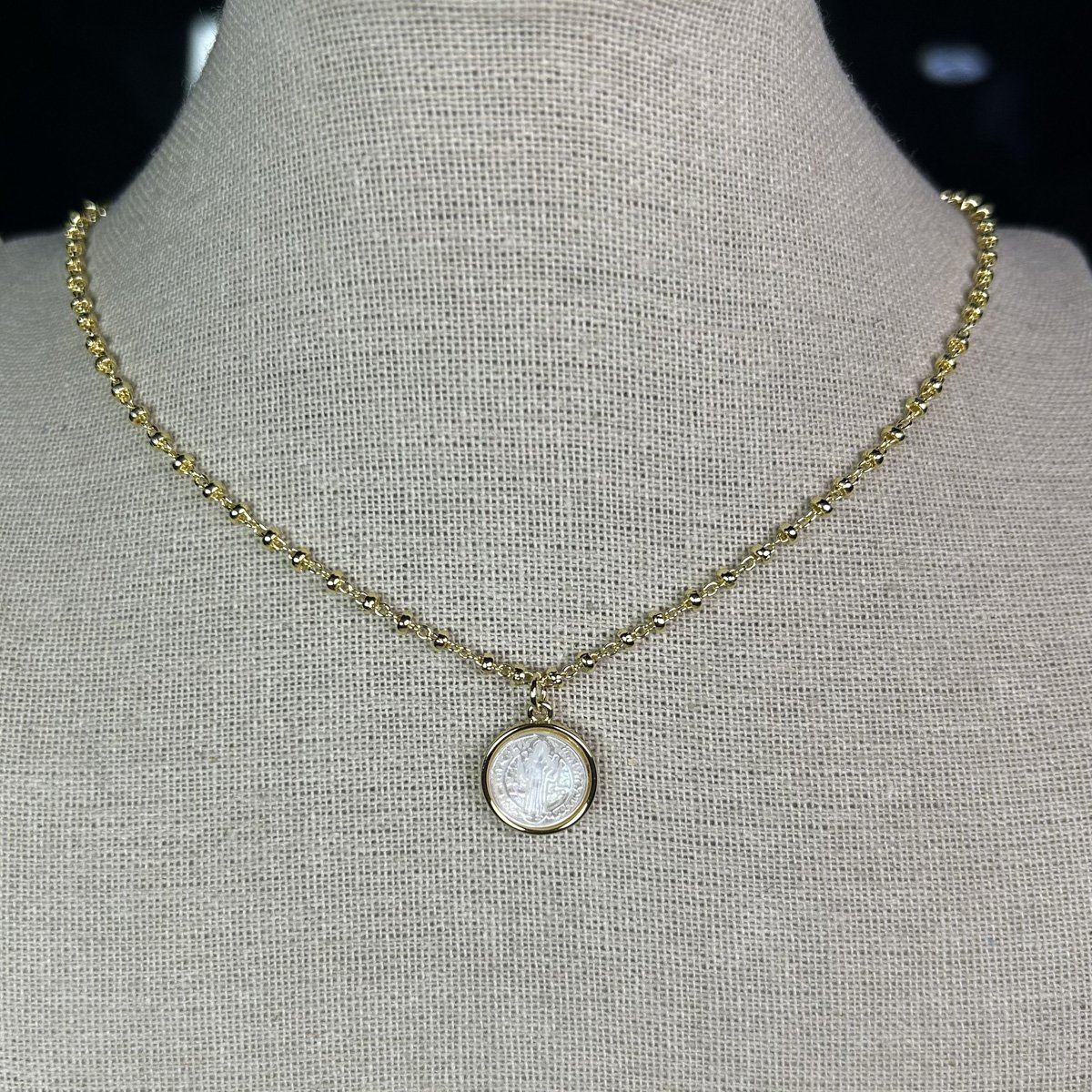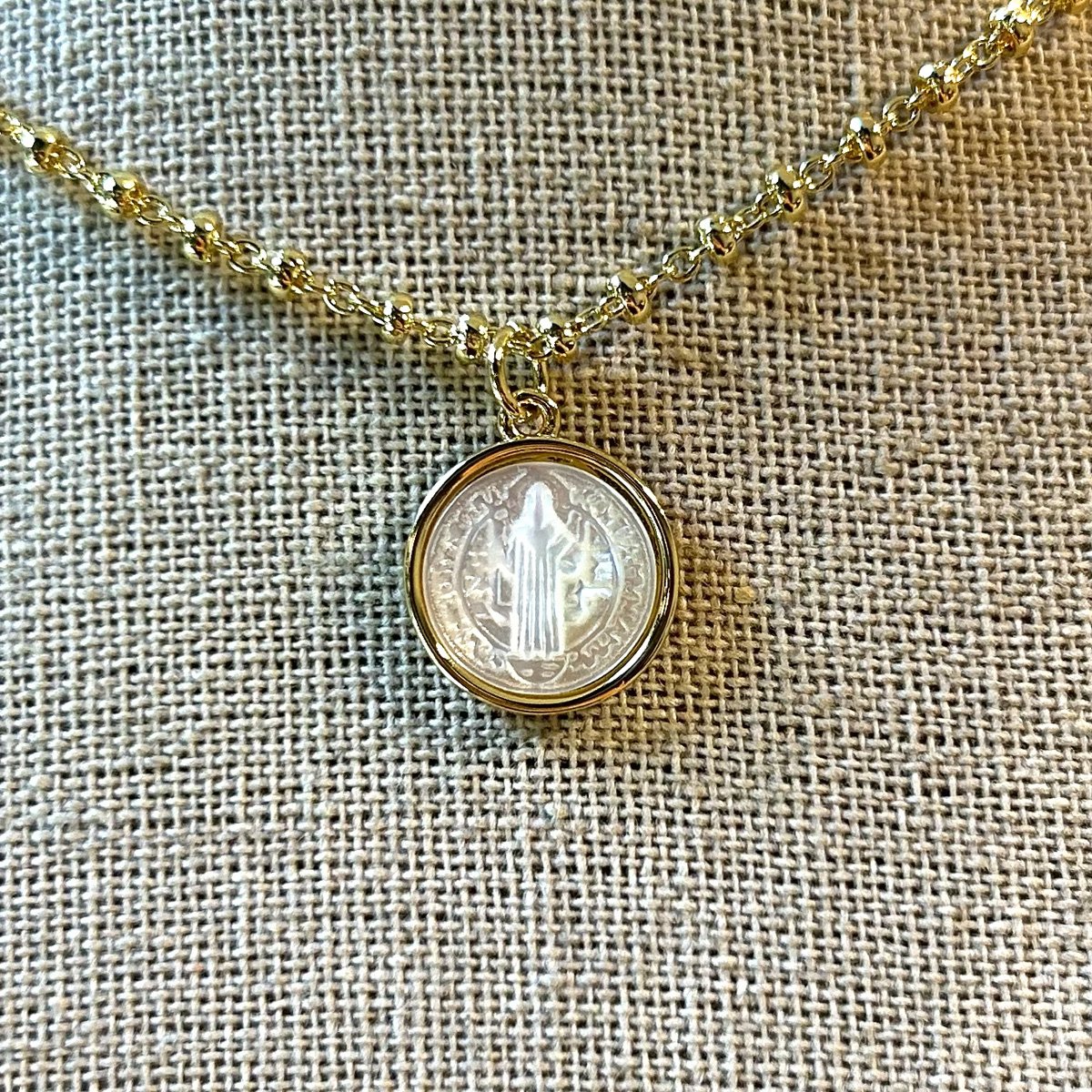 Sé el primero en valorar “Collar baño oro San benito en Nacar (251125-020)”