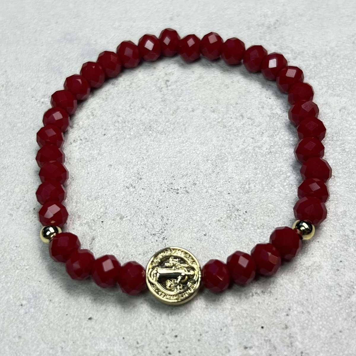 Pulsera baño oro Elastica con cristales rojo con dije de san benito (251125-016)
