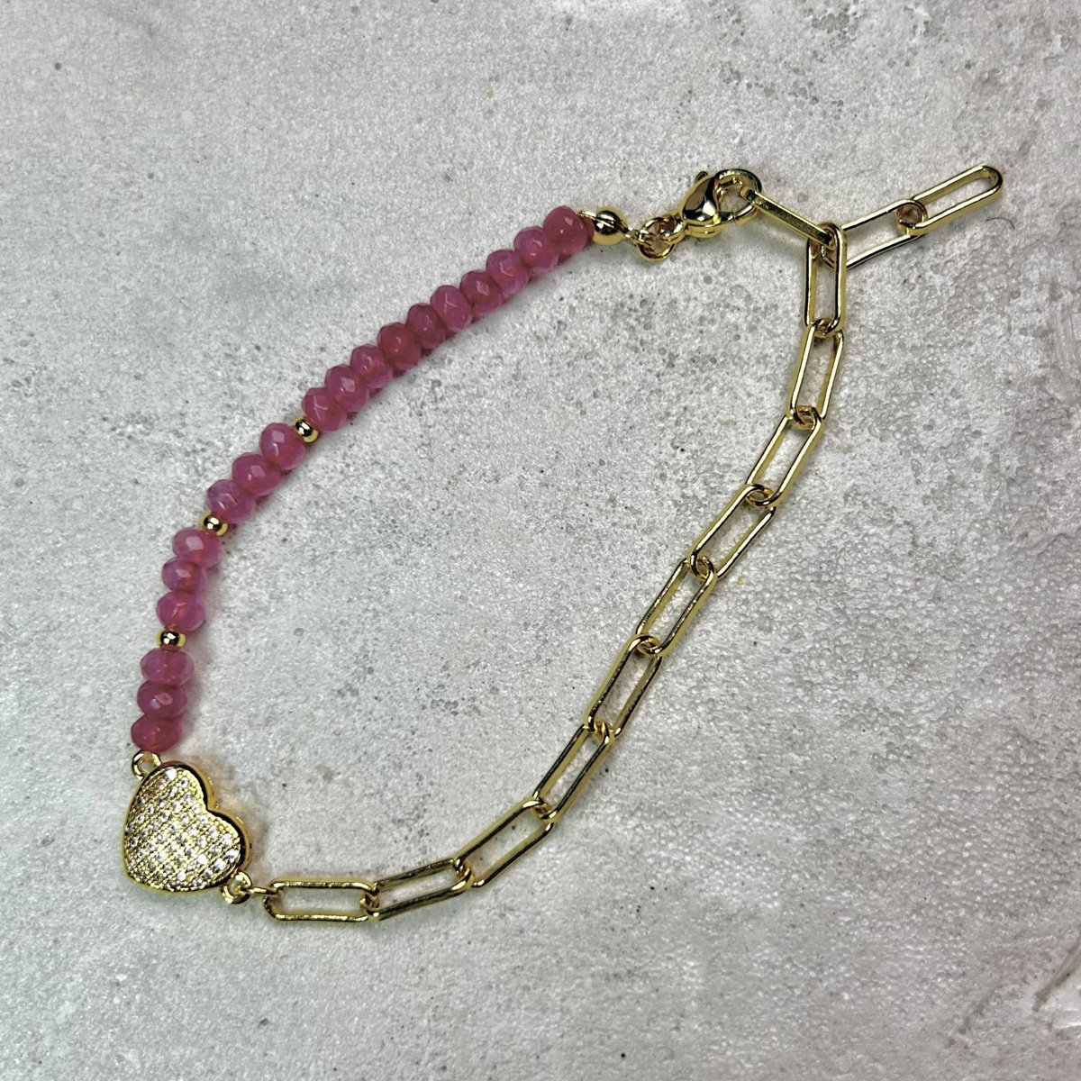Sé el primero en valorar “Pulsera baño oro Mitad cadena de eslabones y agatas rosadas con dije pasador de corazon en circón (251125-051)” Cancelar respuesta